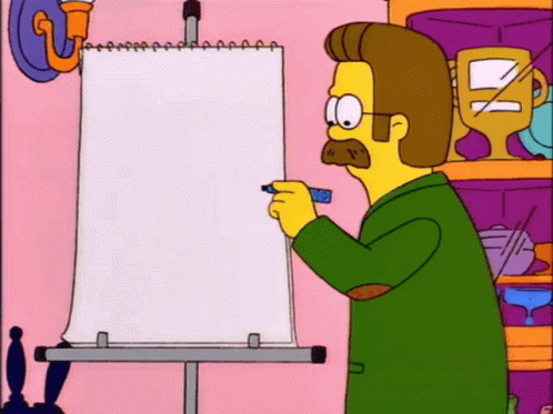 Ned Flanders draws dots on an easel, then shares a moment with Maude Flanderes, saying 'It's good for keeping down the urges.'