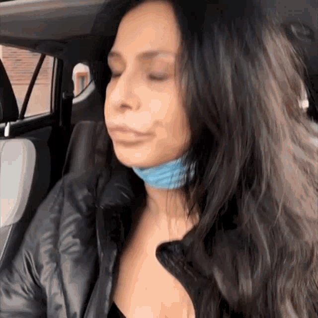 Woman in car puts on a face mask and gloves, preparing for COVID-19 safety.