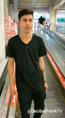 Man runs quickly up a downward-moving escalator, a prank by Decibel Prank TV, possibly for forgetting mom's request.