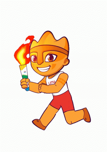 Cartoon mascot for Lima 2019 Pan American Games holding a flaming torch, ready to run.