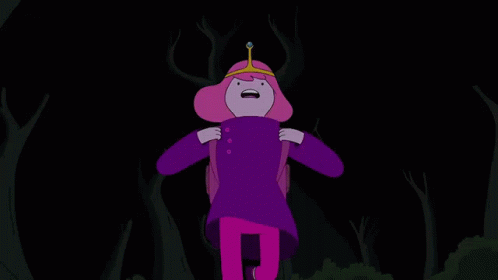 Princess Bubblegum from Adventure Time runs through a dark forest, appearing surprised or scared.