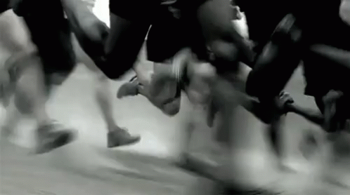 A dynamic black and white shot of many people running, their feet kicking up dust as they move rapidly.