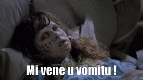 A meme featuring a woman and a man with the Corsican phrase 'Mi vene u vomitu!' (I feel like vomiting!).