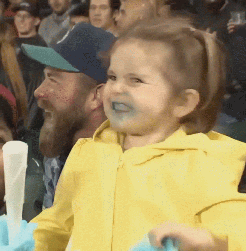 An excited little girl, Beatrix, in a yellow raincoat enjoys cotton candy at a baseball game.
