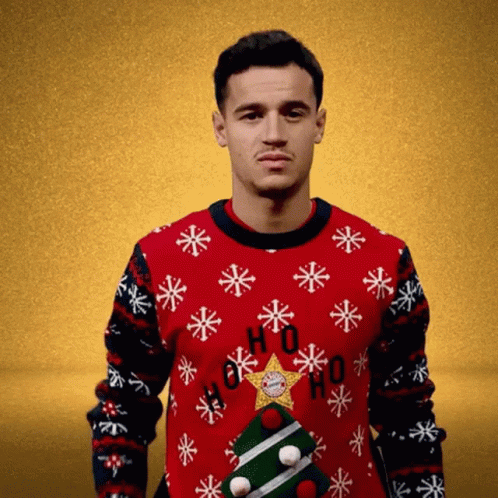 Coutinho in a festive Christmas sweater blows a kiss and smiles, spreading holiday cheer.