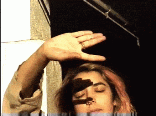 Woman with rings on her fingers shields her eyes from a bright glare, squinting in the light.