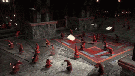 Gnomes from Rise Of The Guardians are busy dancing in a dark room with a red patterned floor.