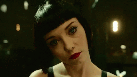 A woman with dark hair and red lipstick stares intensely at the camera, a creepy scene from Sy Fy's Blood Drive.