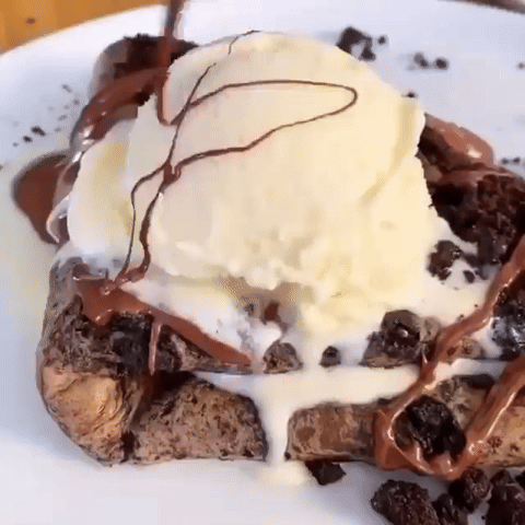 a close up of a dessert with ice cream and chocolate sauce on a white plate