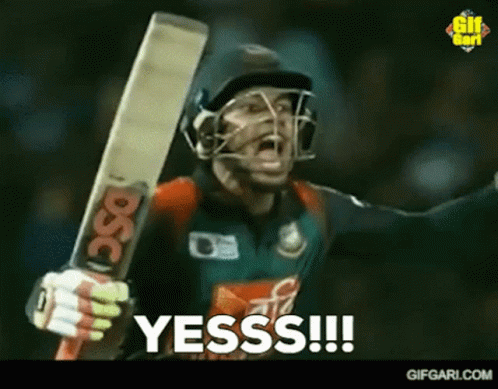 Mushfiqur Rahim, a Bangladesh cricket player, celebrates enthusiastically with his bat, shouting 'YESSS!!!'
