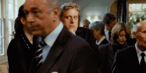 Alan Tudyk looks visibly uncomfortable and cringeworthy in a suit and tie, surrounded by a crowd of people.