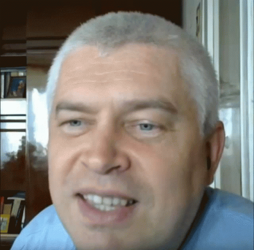 A close-up of Gorin's face as he delivers a wide, somewhat cringe-worthy smile, showing his teeth.