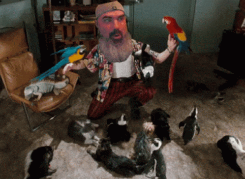 Cringer, a pet lover, is seen singing while surrounded by penguins, parrots, and other animals.