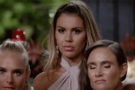 A woman with a surprised and slightly disgusted expression, standing with two other women.