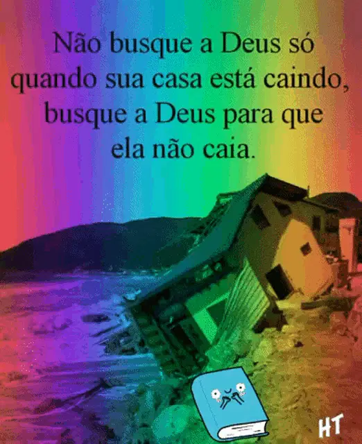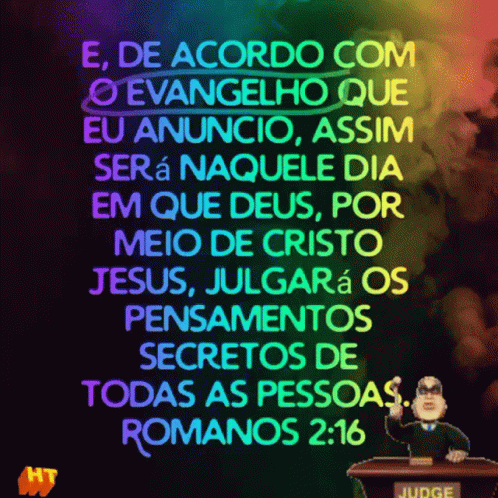 A judge cartoon with a Portuguese Bible verse from Romans 2:16 about God judging secret thoughts.