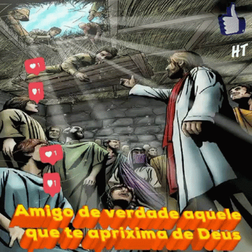 A cartoon depicting Jesus speaking to a crowd, with a message about true friendship bringing one closer to God.