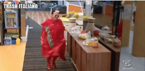 Cristiano Malgioglio in a vibrant red outfit walks and runs through a hallway, passing a 'TRASH ITALIANO' sign.
