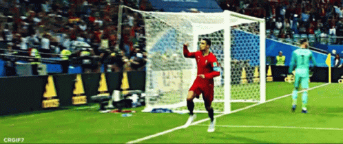 Cristiano Ronaldo celebrates a goal for Portugal, running towards the crowd with his iconic "Siuuuu" celebration.