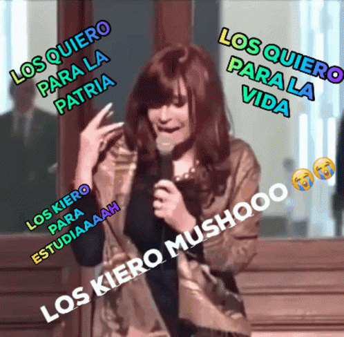 Cristina passionately speaking into a microphone, expressing 'Los Quiero Mucho' (I Want Them Very Much) with overlaid text.
