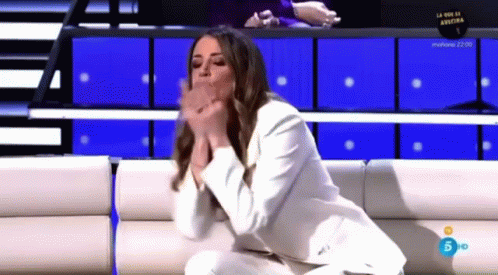 Cristina Porta makes a heart gesture with her hands while sitting on a white couch, spreading a message of love.