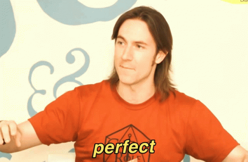 Matthew Mercer from Critical Role gives a double thumbs-up, wearing a red shirt with 'perfect' written on it.