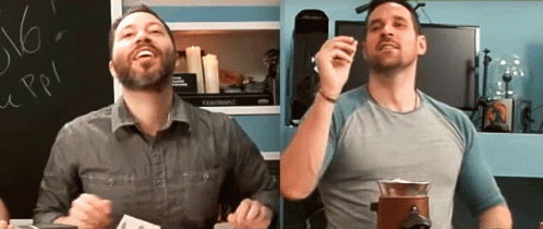 Sam Riegel and Travis Willingham from Critical Role react dramatically to a thrown object, with Sam catching it.