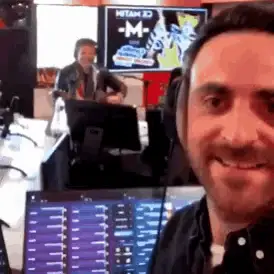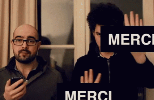 Karim Debbache and a colleague hold "Merci" signs, expressing gratitude.