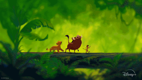 Simba, Pumbaa, and Timon walk across a log, with Simba growing from cub to adult, set against various scenic backdrops.