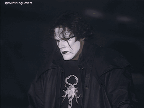 Crow Sting makes a dramatic appearance in the rafters during a WCW Monday Nitro event, showcasing his iconic dark persona.
