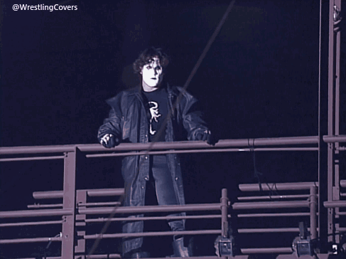 Crow Sting, the iconic wrestler, makes a dramatic appearance on the rafters during a WCW event.