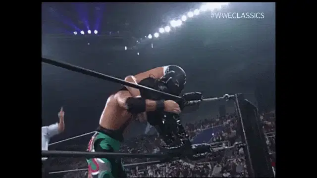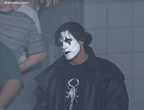 Crow Sting, with his iconic white face paint and black scorpion shirt, stares intensely in WCW.