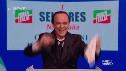 Maurizio Crozza impersonates Silvio Berlusconi at a political rally, holding a prop.