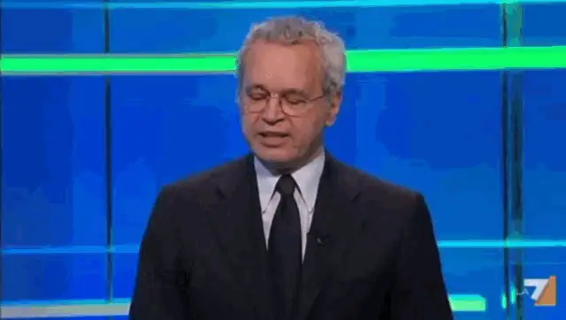 Maurizio Crozza impersonates Enrico Mentana, exclaiming 'AEE EVIDENTEMENTE' on TG LA7.