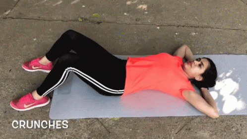 Anwesha performs crunches on a yoga mat outdoors, demonstrating the core exercise.