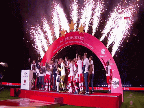 Red Star Belgrade (Crvena Zvezda) football team celebrates winning the Serbian Super League 2019/2020 championship with fireworks.