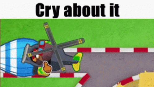 A Bloons TD6 Heli Pilot crashes into a MOAB on a race track, accompanied by the meme text "Cry about it."