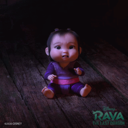 Little Noi, the adorable baby from Disney's Raya and the Last Dragon, sits on a wooden floor, looking distressed.