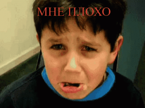 A young boy cries with the Russian caption 'МНЕ ПЛОХО' (I feel bad) displayed above him.
