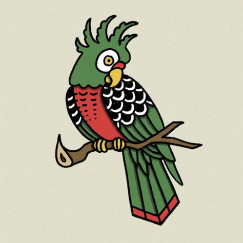 A vibrant green and red parrot illustration in a cryptoflash tattoo style, perched on a tree branch.