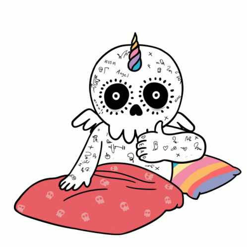 Cryptomories character Morie, a sugar skull with a unicorn horn, gives a thumbs up and says 'GM'.