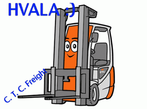 Animated forklift mascot for Ctc Freight winks and sticks out its tongue, with 'Hvala' (Thank you) text.