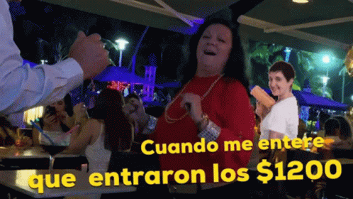 Woman in red shirt dancing excitedly at a party after finding out the $1200 arrived, celebrating with joy.