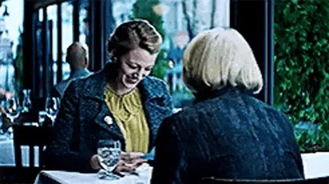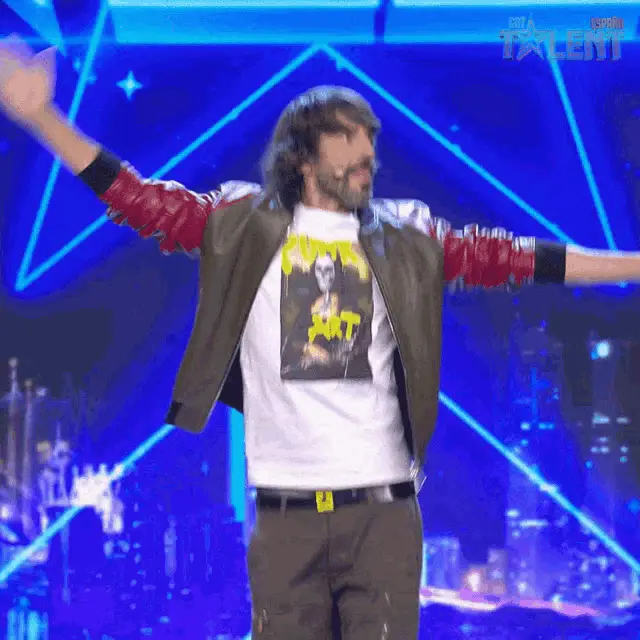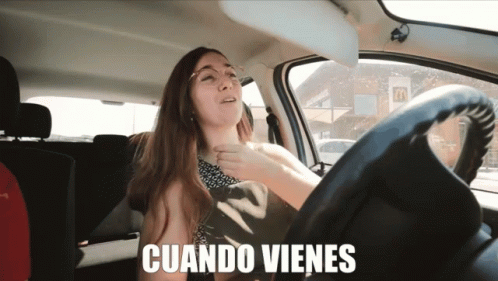 A lively woman in a car, expressing joy and telling a story with the caption 'Cuando Vienes Algo Cae'.
