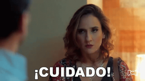 Cecilia Navia as Veronica warns a man with an emphatic '¡Cuidado!' from the Colombian telenovela 'Pa Quererte'.