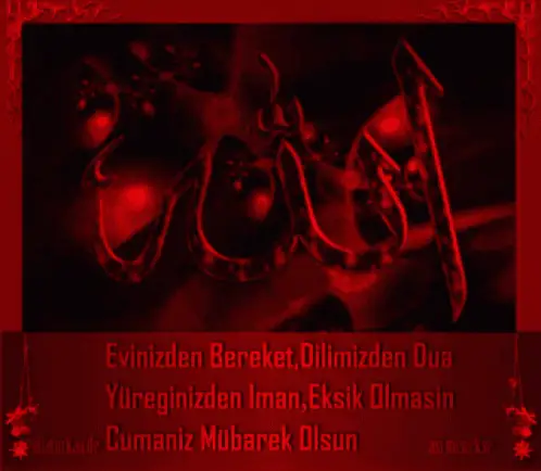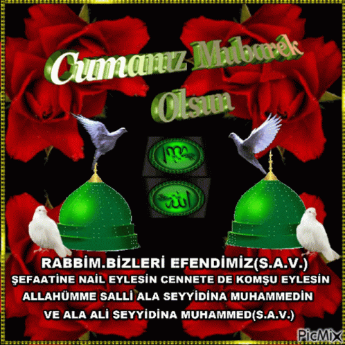 A Turkish greeting card for Friday, featuring Islamic imagery and a prayer for Prophet Muhammad.