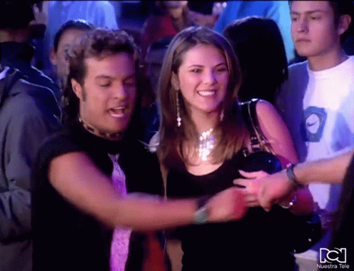 Julian Roman and Margarita Munoz happily dancing cumbia at a lively party, with the 'Nuestra Tele' logo visible.