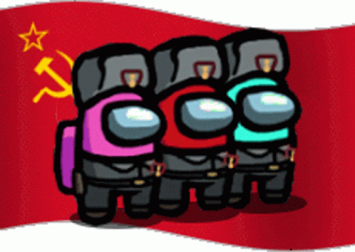 Among Us characters, dressed in Soviet-style uniforms and ushankas, stand proudly before the USSR flag.