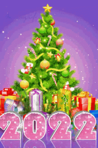 Festive Christmas tree adorned with ornaments and gifts, featuring animated '2022' for New Year celebrations.