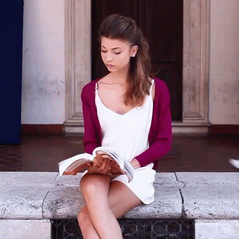 Cuoricino Leggo, a girl in a white dress, reads a book on a ledge at Sapienza University.