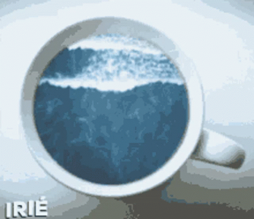 Ocean waves crash and recede inside a white coffee cup, creating a unique piece of cup art.